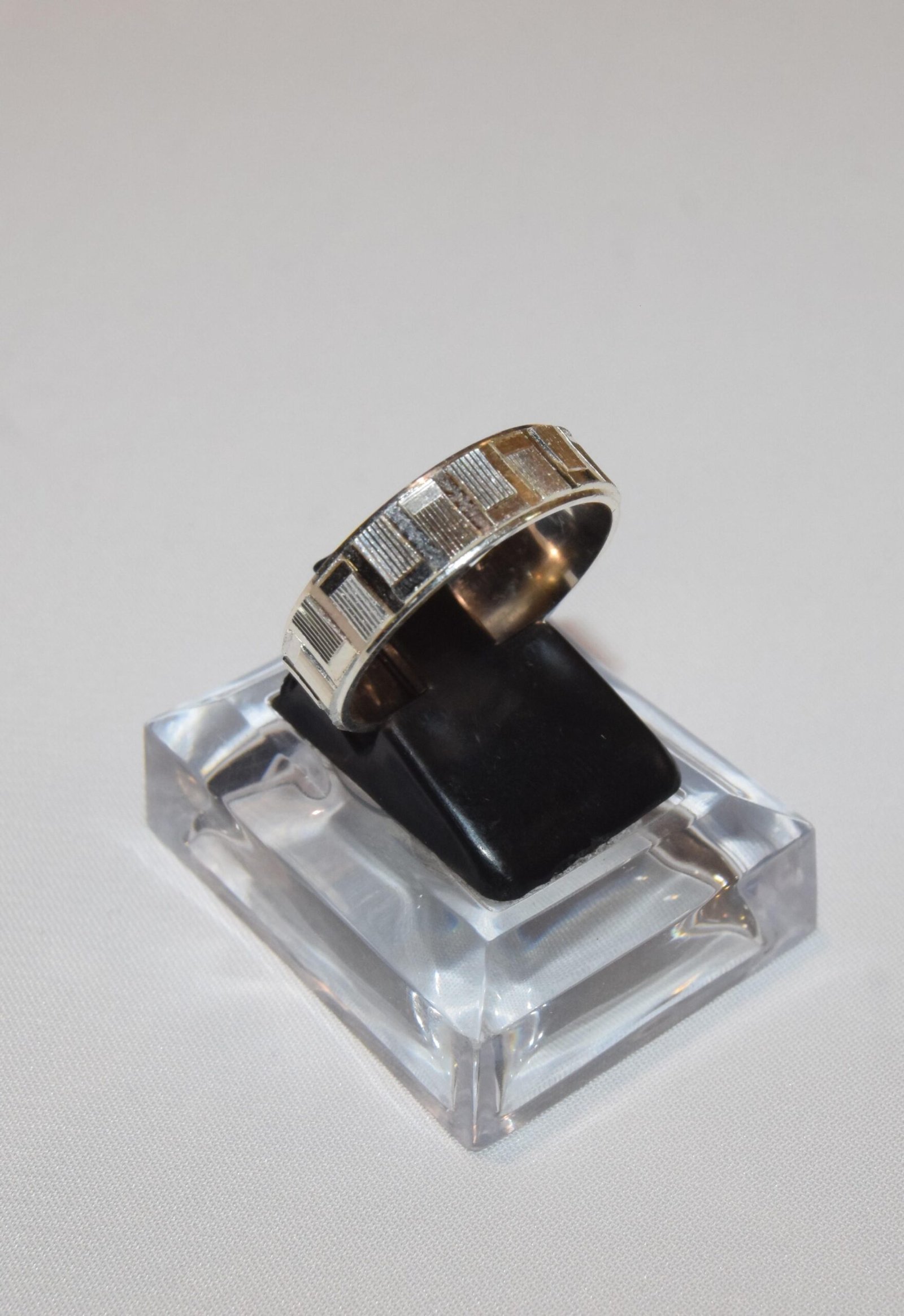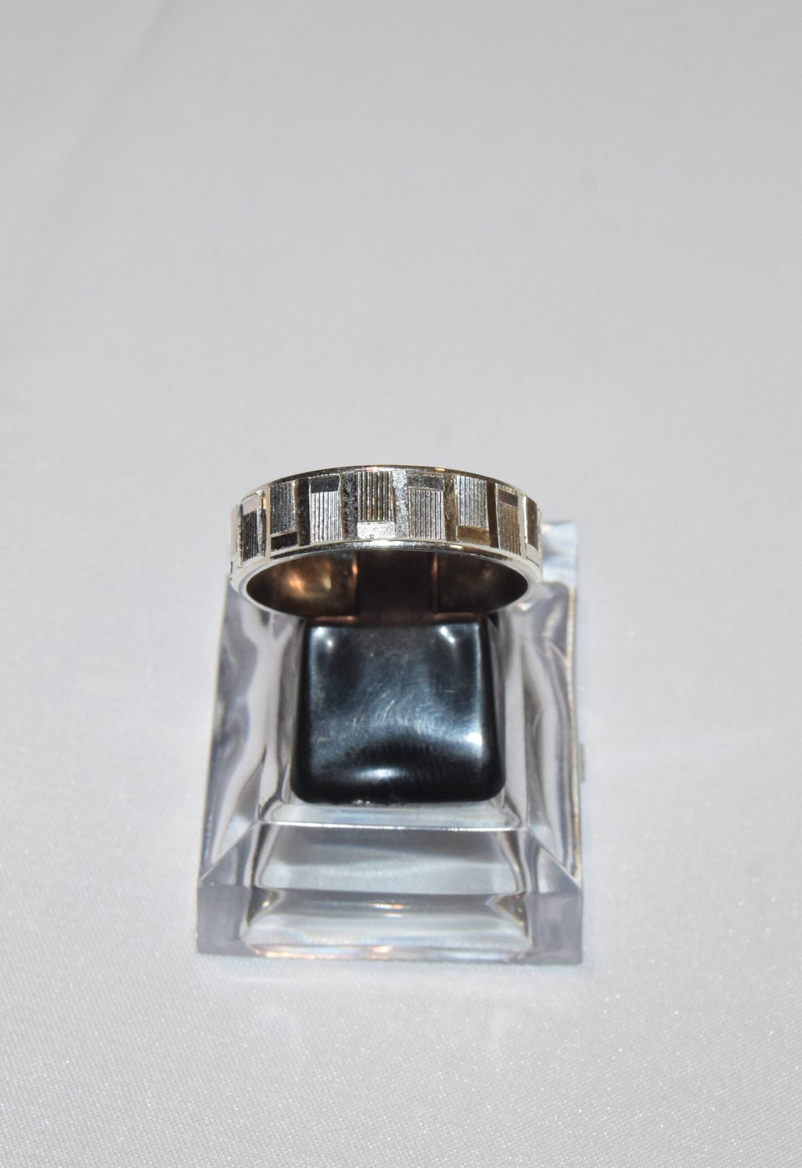 This ring features a sleek, geometric design with a repeating pattern of rectangular shapes etched into the band. This ring offers a modern, minimalist aesthetic with a touch of architectural inspiration. Crafted from polished Italian silver, it’s a subtle yet stylish accessory for the contemporary man.