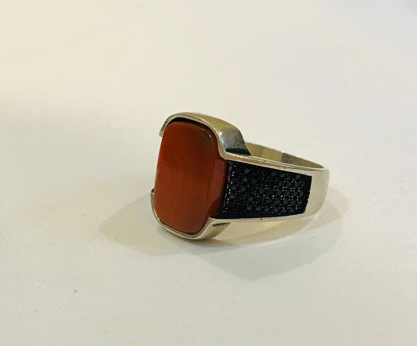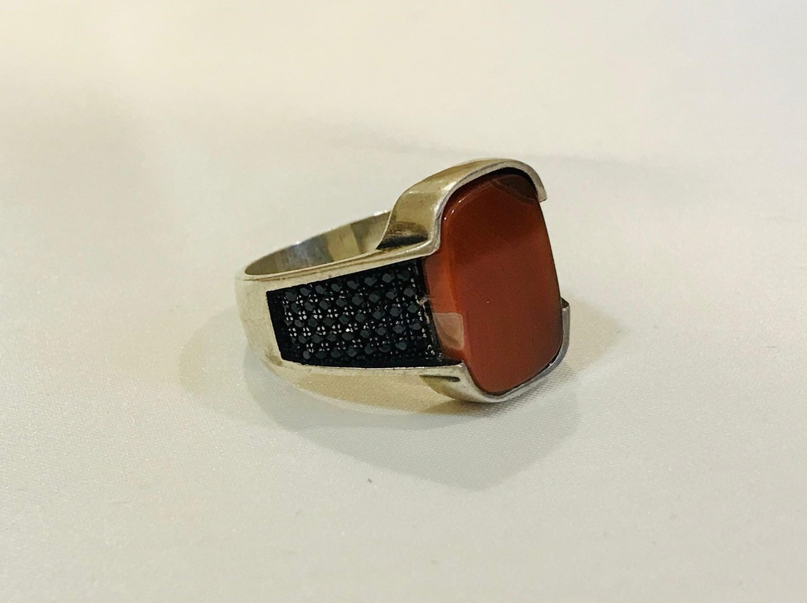 This Turkish silver men’s ring is a symphony of design and luxury. The centerpiece, a resplendent rectangular amber gemstone, commands attention, its rich hue reminiscent of ancient royalty. Encased in lustrous sterling silver, the stone is accentuated by the band’s intricate black textures, creating a striking visual contrast.