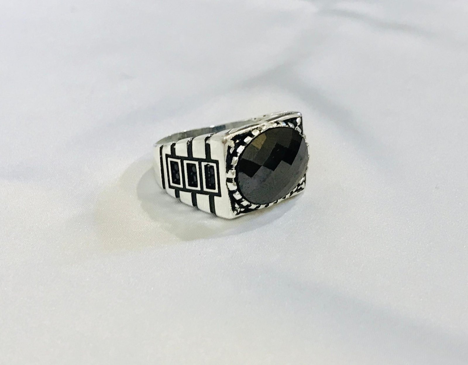 This ring is forged from the finest silver, this ring features a bold black gemstone at its heart, faceted to perfection, reflecting light in a dance of shadows and brilliance. The intricate patterns that adorn its circumference are inspired by the timeless artistry of ancient Turkey, making it not just an ornament but a piece of history.