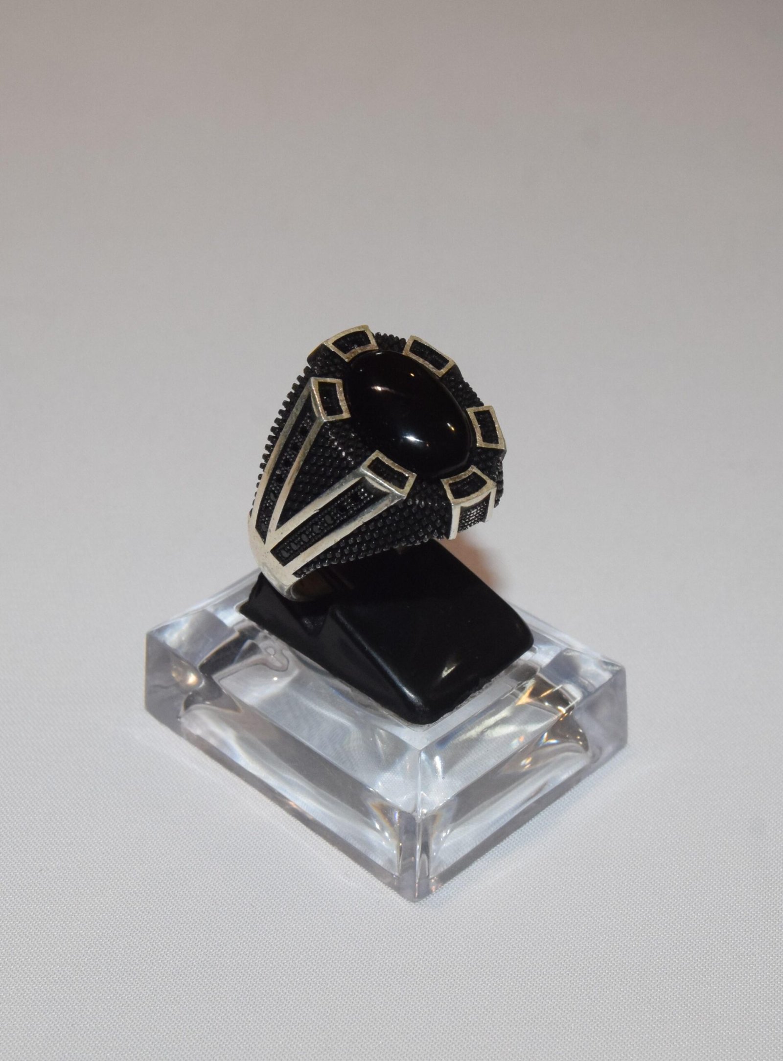 This ring features a captivating round black onyx stone, its polished surface reflecting a sense of timeless strength. The uniquely designed Turkish silver band, with its geometric cutouts, adds a touch of modern sophistication. This ring is a bold statement piece, perfect for the man who values both style and substance.