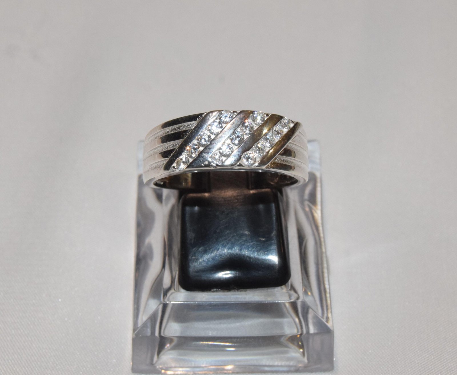 This ring features a sleek band of polished Italian silver, accented with a diagonal stream of sparkling cubic zirconia stones. The clean, modern design exudes a sophisticated masculinity, perfect for everyday wear. This ring adds a touch of understated elegance to any look, making it a versatile accessory for the contemporary man.